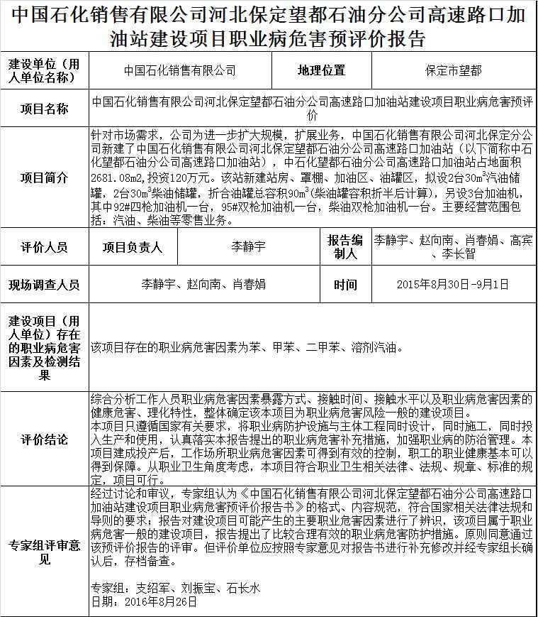 中国石化销售有限公司河北保定望都石油分公司高速路口加油站建设项目职业病危害预评价